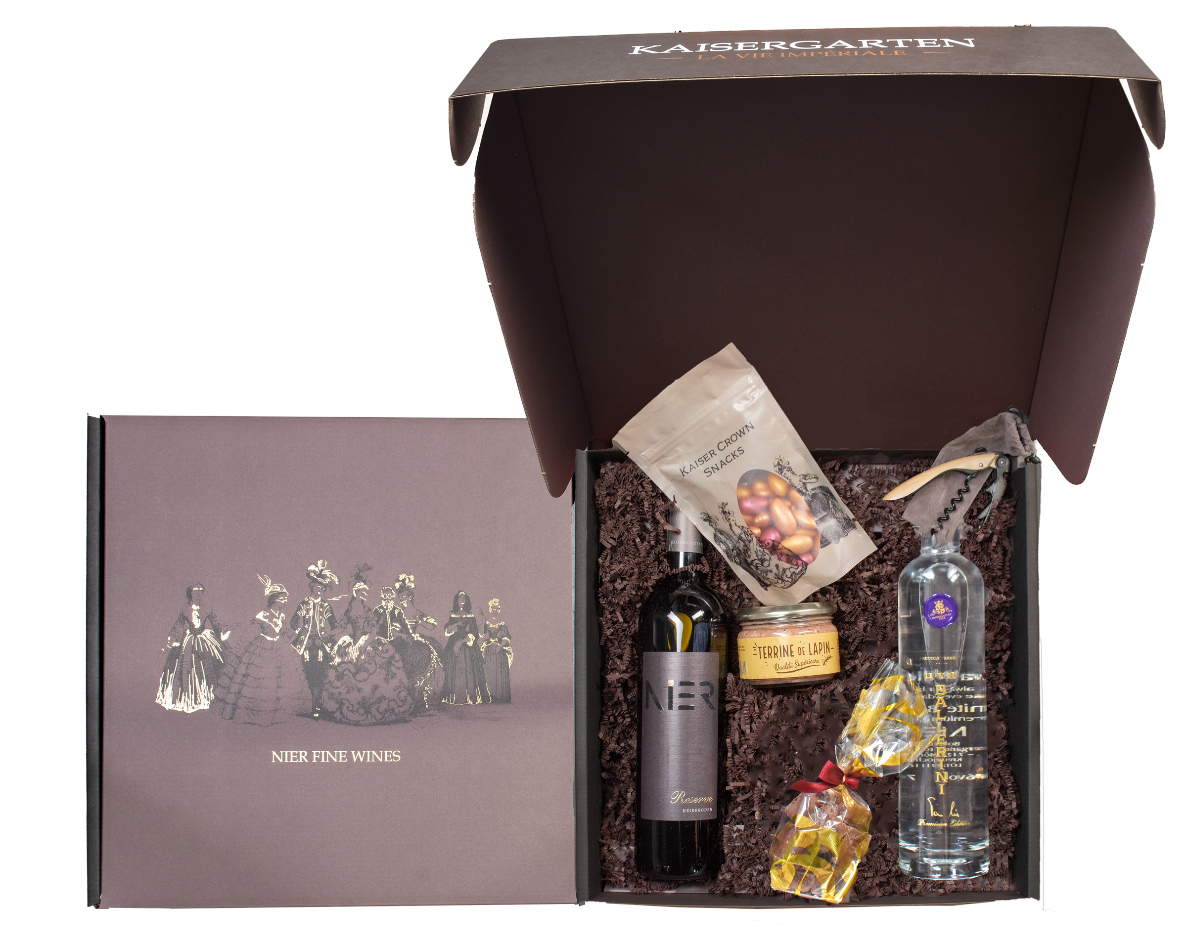 Begleitet von funkelnden Glitzermandeln und zartem Pistazienkonfekt entsteht ein Genussensemble, das süße Raffinesse und erlesene Tradition vereint. Der hochwertige Korkenzieher Edition vollendet das Set – ein Präsent, das Autorität, Stil und Genuss in harmonischer Balance verkörpert.