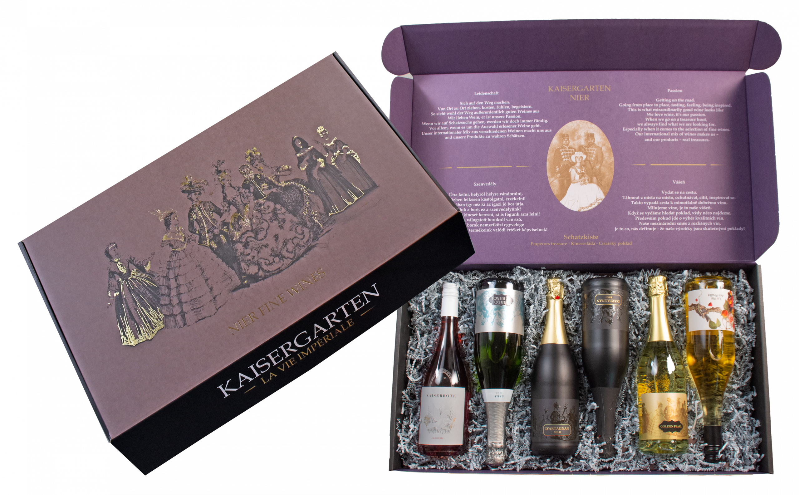 Ein strahlendes Mosaik prickelnder Vielfalt – vereint in einer edlen Kaisergarten Geschenkbox. Sechs ausgewählte Perlen der Schaumweinkunst laden zum Entdecken ein: der goldschimmernde Golden Pearl Sekt mit 22 Karat Blattgold, der elegante UHU Pearl Secco, die charaktervolle Kaiserperle Rieslingsekt trocken, die fruchtige D’Artagnan Scheurebe sweet, die verführerische La Vie Pfirsichperle Secco sowie der feinperlige Cava Mundo de Sueños brut. Ein Ensemble voller Glanz, Eleganz und Genuss – das perfekte Geschenk für wahre Secco-Liebhaber.